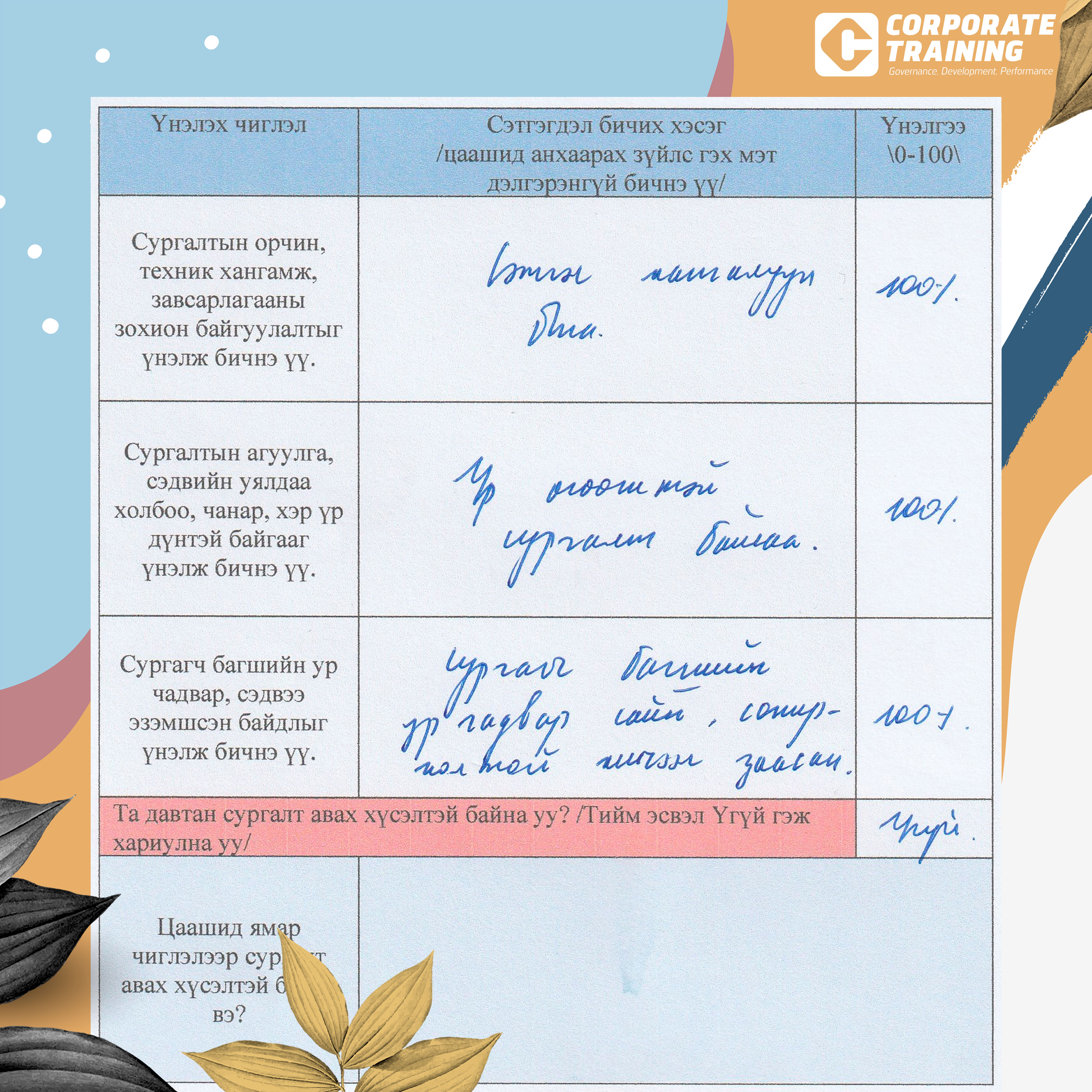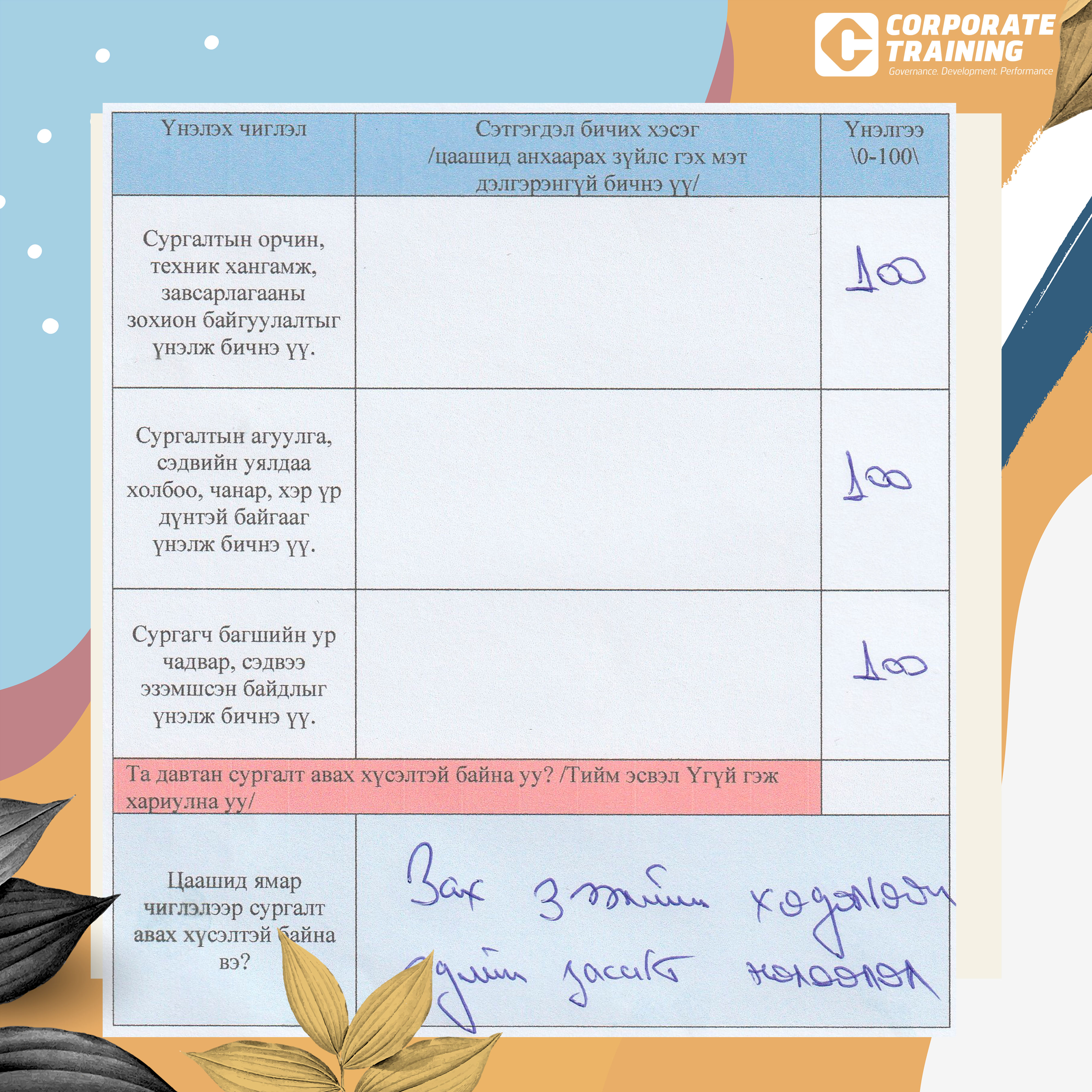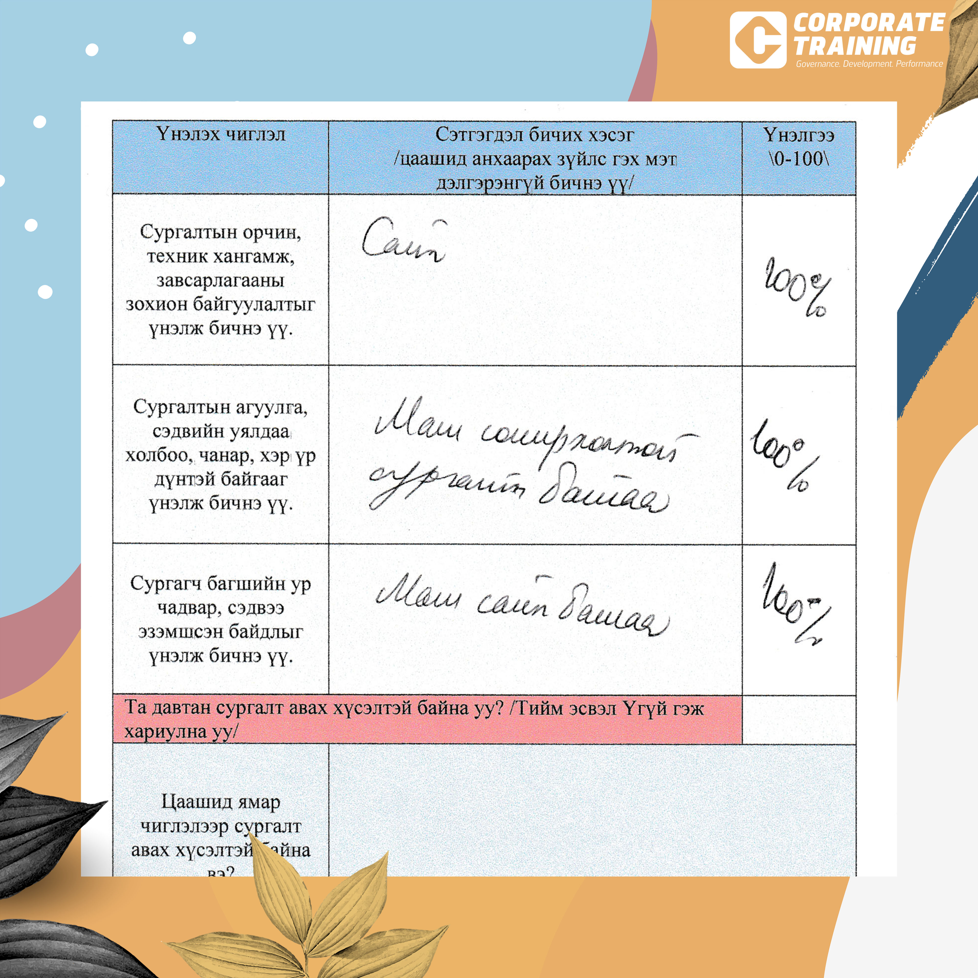 Алсын хараа үнэт зүйлсдээ тулгуурласан урт хугацааны #CEO #PLUS - ЗАХИРЛУУДАД ЗОРИУЛСАН СУРГАЛТ 7 өдрийн 21 цагийн хөтөлбөрөөр 2025 оны 09 сарын 22-ноос 2025оны 09 сарын 30-ны өдрүүдэд Онол+Практик хослосон богино хугацааны сургалт зохион байгуулагдлаа.